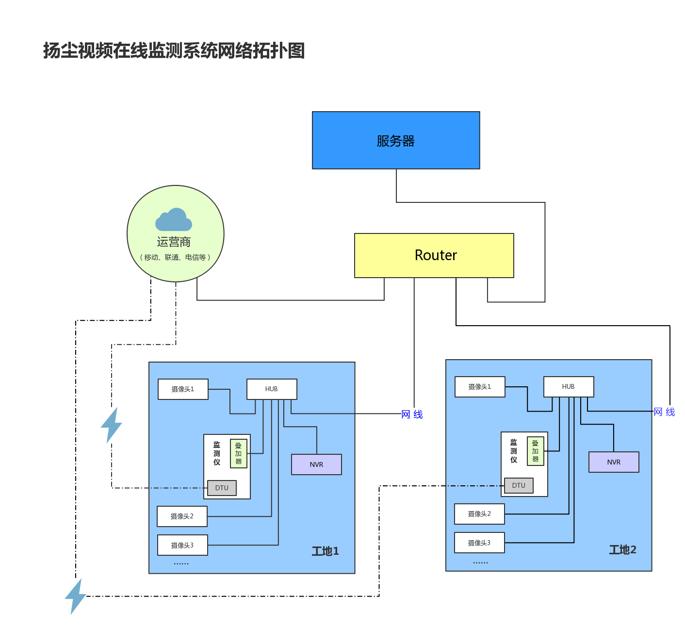 揚塵視頻在線監測系統可以將兩個及以上工地通過無線路由器連接起來,顯示在一個服務器上,方便了運營商的操作與管理。