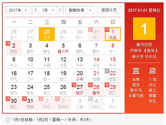 一、 元旦放假時間為2016年12月31日至2017年1月2日放假調休,共3天。1月1日放假,1月2日(星期一)補休。